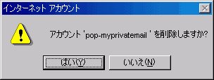 アカウントの削除を削除するには、、「インターネット アカウント」内「メール」タブ→myprivatemailネット用アカウント(例.pop-myprivatemail)を選択→「削除」ボタンを順にクリックします。